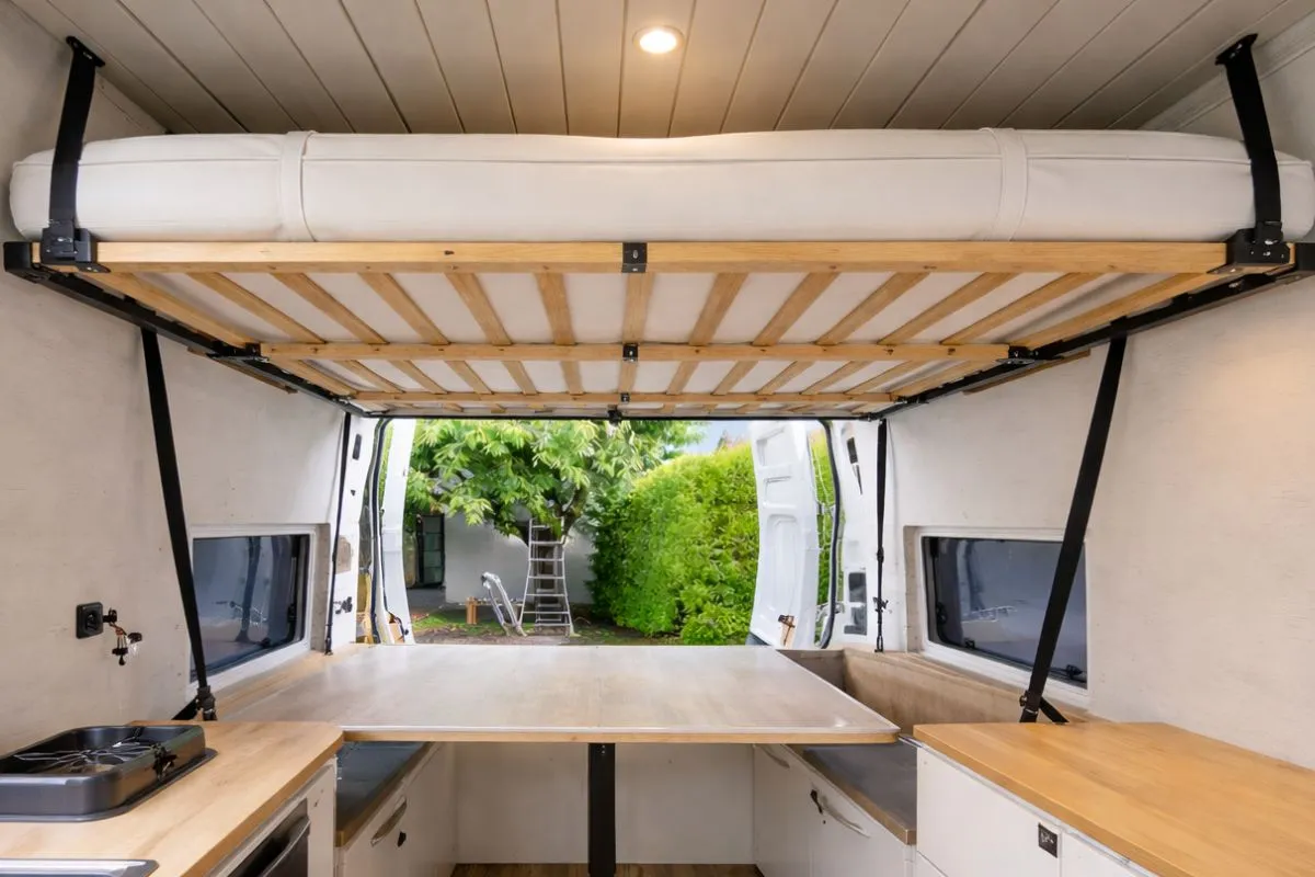 Si votre fourgon permet de tenir debout confortablement sans se courber, le lit escamotable reste envisageable.