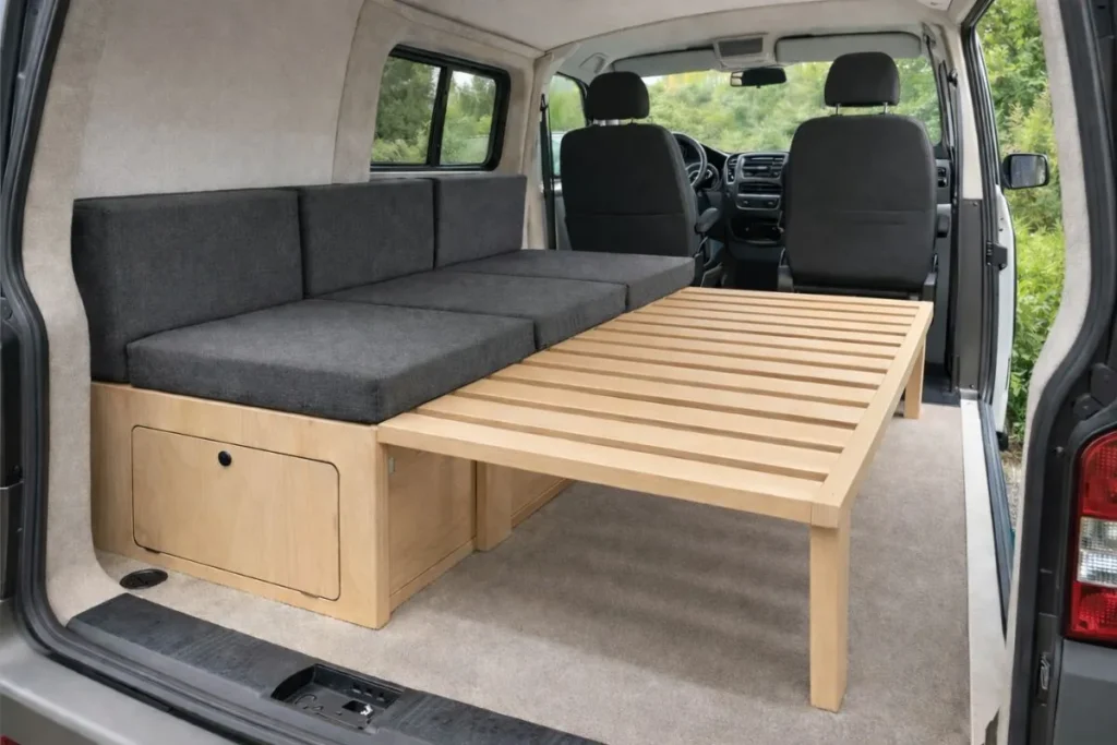Le lit peigne est de loin la solution la plus répandue en van aménagé, et ce n’est pas un hasard. Il permet de conserver un vrai espace de vie la journée tout en offrant un couchage confortable la nuit.